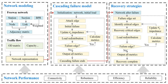 The main innovations of this research are as follows: (1) the development of a cascading failure model that integrates travelers’ route choice behavior using SUE; (2) the proposal of an effective edge-recovery strategy by ranking and prioritizing critical edges based on combined topological and traffic features; and (3) the validation of the methodology using empirical data from a real-world freeway network under multiple failure scenarios.