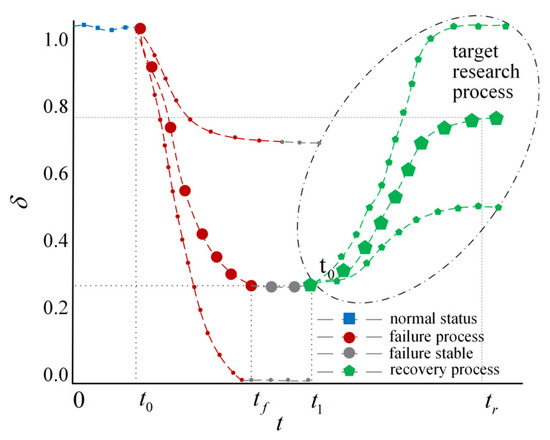 Cascading failure and recovery both fall within the research scope of complex network dynamics. Since cascading failures are unavoidable, studying response strategies after failures occur has practical significance. To better illustrate the research scope of this section, reference [14] presents the network failure and recovery evolution curves shown in Figure 3.
