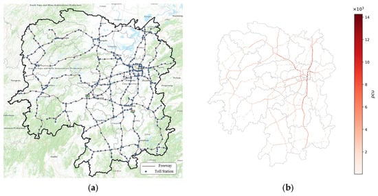 We collected toll data from 1 May to 31 May 2018, obtained by the Hunan Expressway Development and Construction Company. The toll data record the driving process and characteristics of vehicles. Due to equipment and storage system issues, the original freeway OD data contain errors. Therefore, we preprocessed the original freeway OD data. First, abnormal driving behavior and data inconsistent with the toll system time checks were excluded. Secondly, due to the year of data collection being 2018, there might be differences to the current situation. Thus, the OD data demand [46] was adjusted using the expansion coefficient method referring to the official statistical reports. Specifically, the corrected OD demand quantity was , where is the corrected OD demand quantity, is the original OD demand quantity, and the scaling factor is the ratio of the daily total OD quantity in the original data to the daily total OD quantity in the Hunan Expressway Transport Statistical Monitoring Report in 2023. The results of distributing the modified toll data among the road network are shown in Figure 5b.