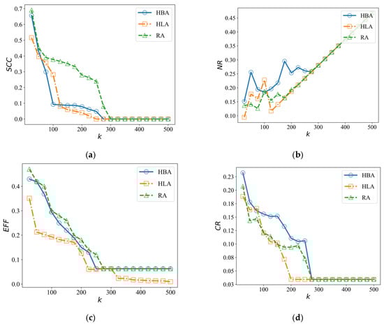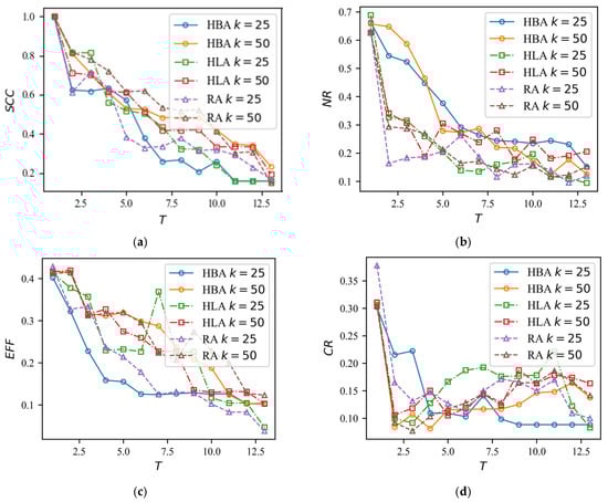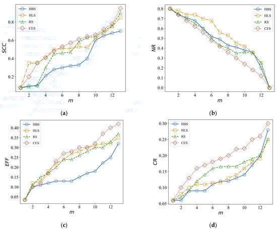 Results of cascading failure evolution. (a) SCC; (b) NR; (c) EFF; (d) CR.