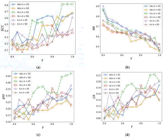 Results of cascading failure under different values. (a) SCC; (b) NR; (c) EFF; (d) CR.