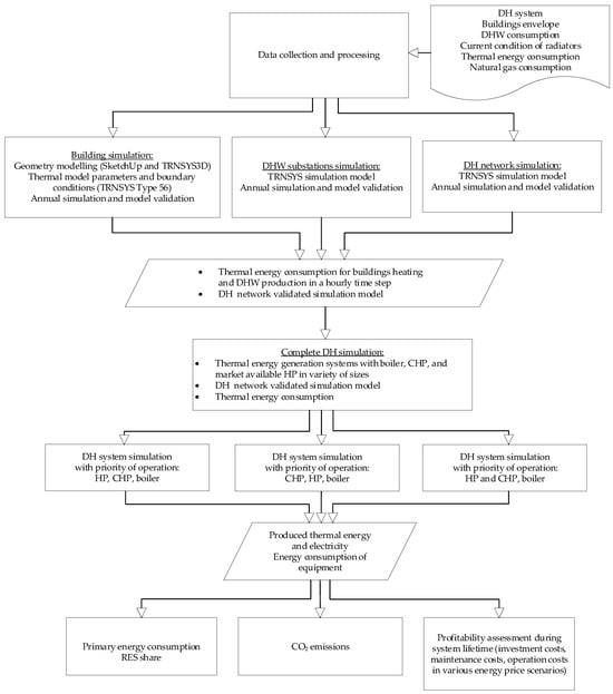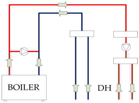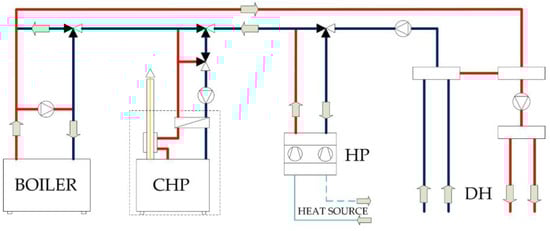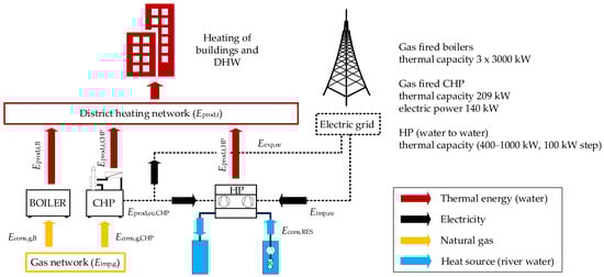 The results from dynamic simulations were used to calculate the system’s energy performance indicators. The scheme of the energy supply concept in the DH system is presented in Figure 3.