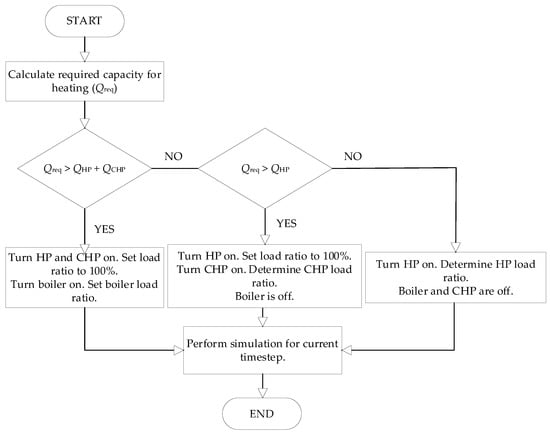 Control logic diagram for prioritised operation of HP, CHP, and boiler (highest to lowest priority).