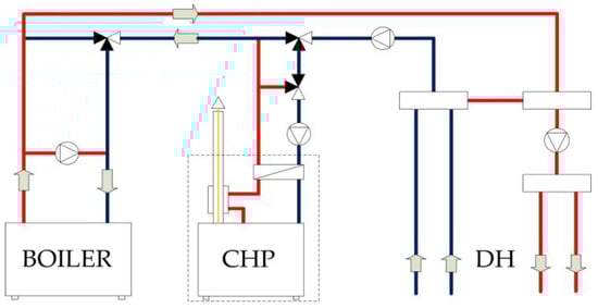 Schematic of a DH system with a gas-fired boiler and CHP unit.
