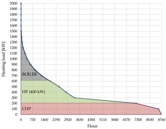 The CHP unit is installed in the return line of the heating system, thereby ensuring priority in the production of thermal energy. The gas-fired boiler is activated when the CHP unit is unable to achieve the required water temperature. A comprehensive system simulation was performed to determine the heating energy required for space heating, DHW, and the heat losses in the distribution network during the year. The simulation results were integrated over an hourly time step to obtain the necessary thermal output. The data were then filtered based on the frequency of occurrence throughout the year and sorted from highest to lowest values.
