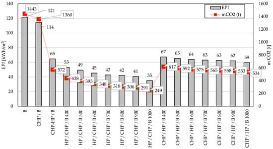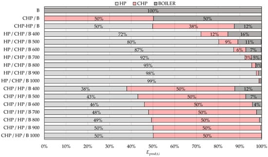 Different operation strategies of equipment for heat and power generation were examined through variants of the system presented in Table 3, along with the thermal capacities of HP units considered in the study. Systems B and CHP-B in the table represent previously mentioned systems with a gas-fired boiler and a gas-fired boiler with a CHP unit.
