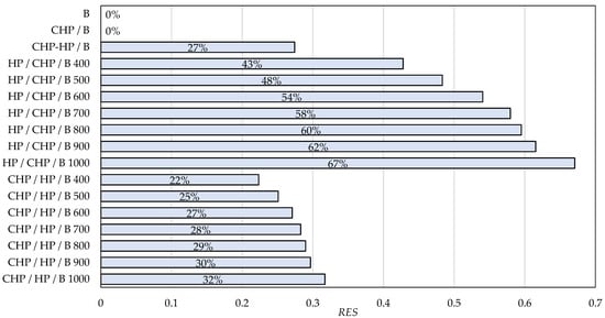 In the Expression (9), Econs,res represents the renewable energy produced in the system. For heat generators powered entirely by natural gas, such as boilers and CHP units, Es,cons,res equals zero, and for systems using HP, it corresponds to the thermal energy derived from the source: