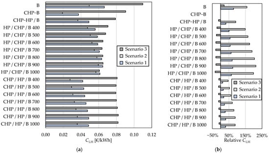 Levelized cost of heating CLH is calculated for all scenarios and system variants considered in this study. It is defined as the ratio of the total system costs to the total thermal energy produced over the evaluation period, as expressed by the following equation: