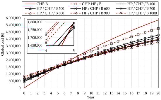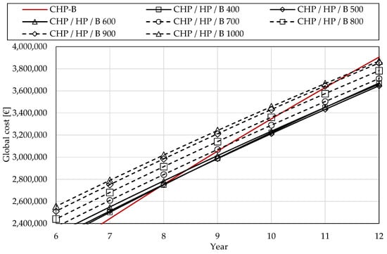 Following the processing of the specified parameters, the TRNSYS 17 simulation environment was utilised to develop the dynamic simulation models. This decision was made due to the TRNSYS 17 environment’s proven capability to model complex interactions within energy systems []. For the sake of clarity, details on this process are briefly elaborated here, with further elaboration available in previous works by the authors. The design of simulation models for systems employing a natural gas boiler, CHP unit, and HP was informed by the thermal energy consumption of the DH system and the requisite thermal energy capacity in design conditions. The boiler and CHP unit were regarded as existing equipment within the system, while the CHP units were considered in a range of sizes. The operation of the CHP unit was simulated based on data provided by the manufacturer, with particular reference to capacities and efficiency at partial load. The operation of HPs was simulated based on manufacturer data. This process incorporated the consideration of efficiency at partial load, as well as variable heat sink and source temperatures. The system control was analysed within the context of three distinct operational strategies. The first operational strategy prioritised the operation of HP over CHP. The second operational strategy prioritised the operation of CHP over HP. The third operational strategy involved the simultaneous operation of CHP and HP, with adjustments made to meet the required thermal energy demands. In all three of the considered operational strategies, the priority assigned to the boiler operation was the lowest. Simulations were performed for a whole year operation of the DH system to include a realistic scenario comprising peak load periods during the winter period and those with lower load during the transitional and summer period. Outputs from simulations provided data on the produced and consumed energy by each generator in the system, enabling the calculation of key performance indicators, including primary energy consumption, the proportion of renewable energy within the system, and CO2 emissions. An economic analysis was conducted over the system’s lifecycle, considering three energy price scenarios to evaluate the investment’s profitability.