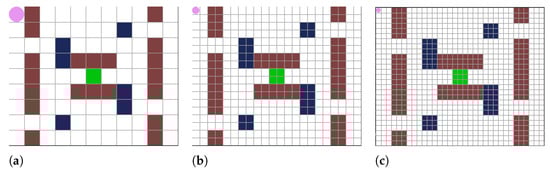 Grid-world scenarios. (a) Scenario 1 (). (b) Scenario 2 (). (c) Scenario 3 ().