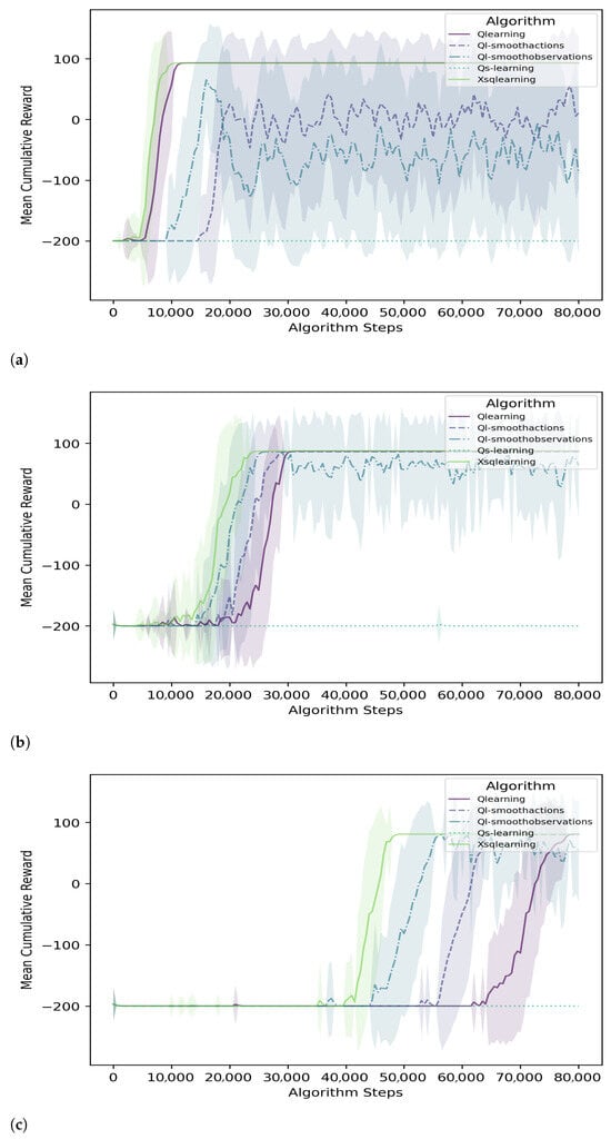 In the simplest environment (), both XSQ-Learning and conventional Q-Learning achieved successful policy convergence, though with notable differences in learning efficiency. XSQ-Learning achieved its first stable maximum reward of 93 in an average of 6650 steps, whereas Q-Learning required approximately 22.56% more steps on average (8150 steps) to reach the same outcome. In contrast, the similarity-based variants (QL-SmoothActions, QL-SmoothObservations, and QS-Learning) frequently failed to surpass the minimum reward threshold of −200. Specifically, QL-SmoothActions failed in 10 out of 20 trials, while QL-SmoothObservations and QS-Learning failed in all trials. These results suggest that, in small state spaces, the computational overhead introduced by similarity mechanisms may hinder performance unless carefully controlled, as demonstrated by XSQ-Learning’s adaptive threshold and parameters.