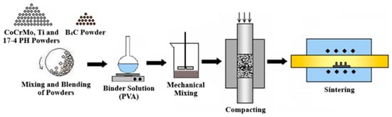 The fabrication of B4C-reinforced CoCrMo, Ti, and 17-4 PH alloys was accomplished through the implementation of conventional powder metallurgy (PM) techniques. The raw materials included cobalt powder with 99.5% purity, produced by Alfa Aesar, chromium, molybdenum, and titanium powders with purity levels ranging from 99.5% to 99.9% and a particle size of 44 μm, produced by Nanokar Nanotechnology. The 17-4 PH stainless steel powder, characterized by a grain size of 22 μm and a purity of 99.9%, is produced by (Carpenter Technology, Philadelphia, PA, USA). The boron carbide (B4C) powder employed as the reinforcing phase exhibited a purity of 99%, a density of 2.52 g/cm3, and a particle size ranging from 100 to 150 μm, produced by (Nanokar Nanotechnology, Istanbul, Türkiye).