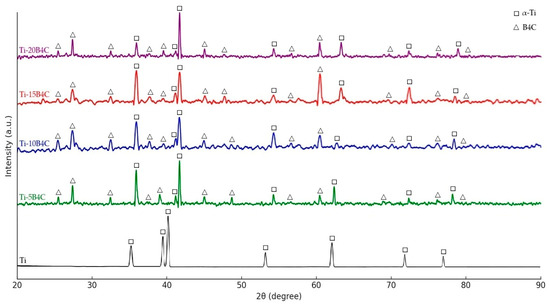 - XRD analysis revealed a distinct α-Ti phase structure in pure Ti. Peaks corresponding to B4C were observed in samples to which B4C had been added. The incorporation of B4C led to an augmentation in peak intensity.
