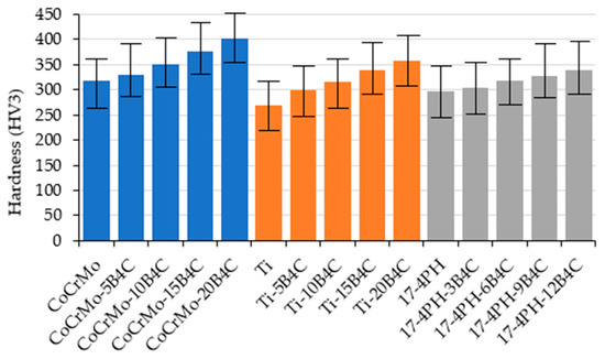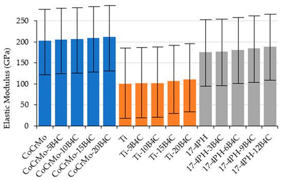 The elastic modulus values, as measured by the ultrasonic pulse-echo method (Figure 17), demonstrated a positive correlation between the elastic modulus and the B4C content. While CoCrMo-B4C samples exhibited the highest values, Ti-B4C composites have the potential to mitigate the stress-shielding effect by offering elastic modulus values that approximate those of bone. This is of paramount importance in the context of ensuring biomechanical compatibility between the implant and the bone [30,31].
