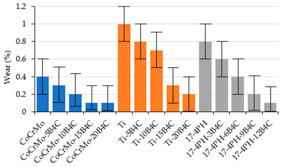 The wear performance of the materials was evaluated through pin-on-disk testing. As illustrated in Figure 16, there was a substantial decrease in wear rates with the incorporation of B4C in all alloy groups. The Ti-B4C composites demonstrated the most optimal wear resistance, particularly the Ti-20B4C.