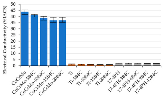 Conductivity measurements (Figure 18) demonstrated a decline in conductivity across all groups, attributable to the insulating nature of B4C. The decrease was more pronounced in Ti alloys. This is not a significant disadvantage in biomedical applications because the primary functions of implants are mechanical load bearing and biocompatibility.
