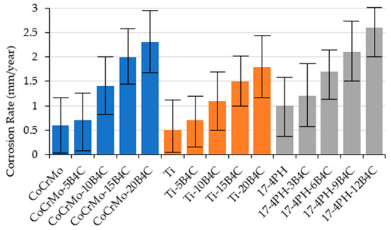 While these individual studies offer valuable insights, there remains a lack of comparative, systematized evaluations of B4C-reinforced CoCrMo, Ti, and 17-4 PH alloys using identical fabrication and testing protocols. The objective of this study is to address this research gap by evaluating the microstructural, mechanical, and electrochemical properties of these alloys reinforced with varying B4C contents. The ultimate objective is to ascertain compositions that demonstrate optimal performance for load-bearing orthopedic and dental implant applications.