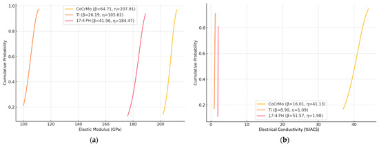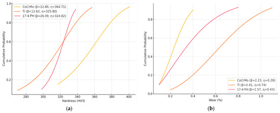 CoCrMo demonstrates the highest mean hardness (η = 364.71) with moderate variability (β = 12.80). The 17-4 PH alloy exhibits the highest degree of consistency (β = 26.09), suggesting reliable hardness properties that are well-suited for predictable biomedical applications (Figure 21a).