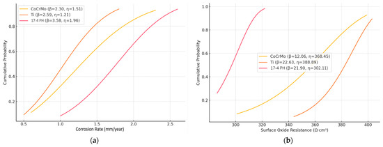17-4 PH alloys demonstrate higher corrosion rates (η = 1.96) with the greatest consistency (β = 3.58), suggesting predictable yet elevated corrosion rates. Ti-based alloys exhibit intermediate corrosion resistance, rendering them well-suited for environments characterized by moderate levels of corrosion (Figure 23a).