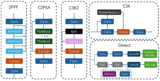 In the backbone and neck of the YOLO11 architecture, a novel C3K2 module is introduced [33]. It optimizes the computation process, reduces redundant parameters, and enhances feature representation simultaneously. Following the Spatial Pyramid Pooling Fast (SPPF) module [34], a Cross Stage Partial Self-Attention (C2PSA) block [35] is integrated to absorb the model into the target regions and increase the granularity of feature extraction. In the head of the network, YOLO11 adopts an anchor-free decoupled head, which further delineates the processes of box regression and classification. There is no doubt that these modifications significantly enhance efficiency. Meanwhile, these updating strategies enable the model to maintain high throughput even when processing high-resolution inputs.