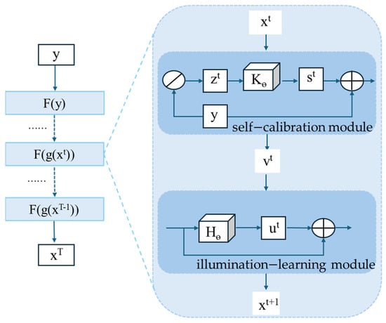 In Equation (2), denotes the calibrated input to the next stage, and represents a learnable parametric operator. On this basis, the input to the illumination-learning process becomes this calibrated output, and the basic unit of the illumination-optimization process can be expressed as Equation (3).