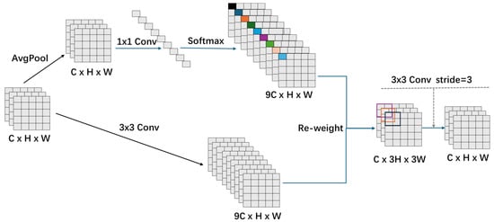 RFAConv segments the input feature map into non-overlapping patches, each corresponding to a receptive field, thus transforming spatial features into receptive-field representations. Each patch undergoes average pooling to aggregate receptive-field features and capture global context. A 1 × 1 convolution then enables feature interaction across receptive fields, strengthening feature correlation and global expressiveness. The softmax function is used to generate attention weights. These weights reflect the importance of features within each receptive field. By multiplying weights with receptive-field features element-wise, salient clues are emphasized, thereby improving extraction effectiveness. A convolution aligns feature mapping matching mechanisms to the attention map. Applying the attention weights and resizing then yields the final RFAConv output.