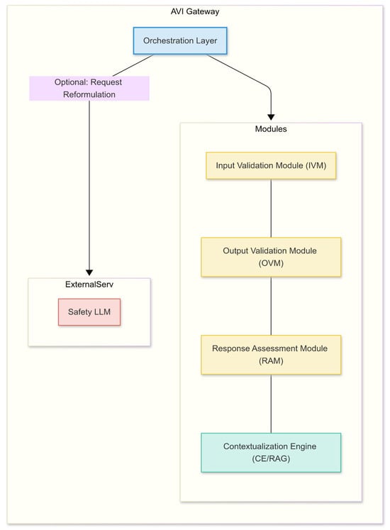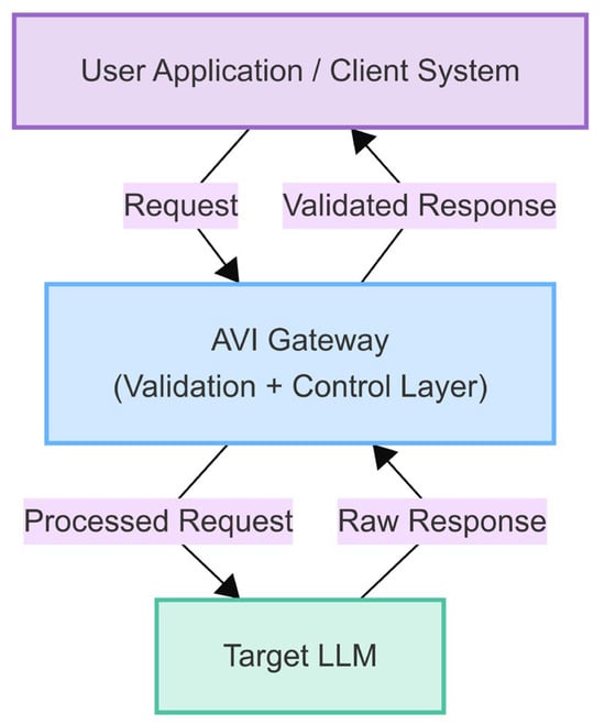 This study introduces and evaluates the Aligned Validation Interface (AVI), a conceptual framework designed to enhance the safety, reliability, and ethical alignment of interactions with large language models (LLMs). The AVI system operates as an intelligent API gateway, intercepting communication between user applications and downstream LLMs to apply configurable validation and modification policies. This architecture ensures LLM agnosticism and facilitates centralized control and monitoring. Underlying AVI is a Compound AI approach, orchestrating multiple specialized modules rather than relying on a single monolithic safety model. This modular design enhances flexibility and allows for the integration of diverse validation techniques (Figure 1). The primary goal of AVI is to enable safer, more reliable, and ethically aligned interactions by proactively validating and modifying the communication flow based on configurable policies, offering an alternative or supplement to relying solely on the often opaque and inflexible internal safety mechanisms built into many proprietary LLMs [37,38]. AVI aims to provide organizations with granular control over LLM interactions, adaptability to specific operational contexts and regulatory requirements (e.g., GDPR and the EU AI Act [39]), and compatibility with a diverse ecosystem of LLMs, thereby promoting responsible AI innovation and deployment across critical sectors such as finance, healthcare, and education [40].