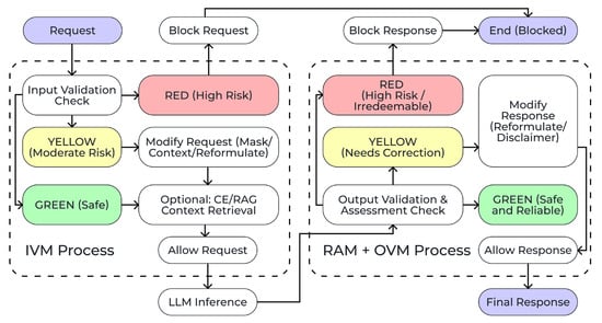 The core modules within the AVI framework are designed as follows: The Input Validation Module (IVM) analyzes incoming requests for security threats (e.g., prompt injection), PII, and policy violations (e.g., forbidden topics) (Figure 3). Conceptually, it combines rule-based systems (regex and dictionaries), ML classifiers (e.g., fine-tuned models based on architectures like Llama 3, Mistral, or DeBERTa V3 for semantic threat analysis), and NER models (e.g., spaCy-based [41] or transformer-based) for PII detection [42]. The Output Validation Module (OVM) scrutinizes the LLM’s generated response for harmful content (toxicity and hate speech), potential biases, PII leakage, and policy compliance, using similar validation techniques tailored for generated text. The Response Assessment Module (RAM) evaluates the response quality, focusing on factual accuracy (hallucination detection) and relevance. Methodologies include NLI models [43] or semantic similarity (e.g., SBERT [44]) for checking consistency with RAG context, internal consistency analysis, and potentially LLM self-critique mechanisms using CoT prompting [45]. The Contextualization Engine (CE/RAG) enables “Positive Filtering” by retrieving relevant, trusted information to ground the LLM’s response. It utilizes text-embedding models (e.g., sentence-transformers/all-MiniLM-L6-v2 [46] as used in the PoC) and a vector database (e.g., ChromaDB [47] as used in the PoC) with k-NN search. AVI’s CE supports both explicit rule–document links (for curated context based on triggered rules) and implicit query-based similarity search against a general knowledge base. An Orchestration Layer manages this workflow, implementing a multi-stage “traffic light” decision logic. Based on validation outputs from IVM, RAM, and OVM against configured policies, it determines the final action: ALLOW (pass through), BLOCK (reject request/response), MODIFY_RAG (add context before LLM call), or MODIFY_LLM (request reformulation by a Safety LLM).