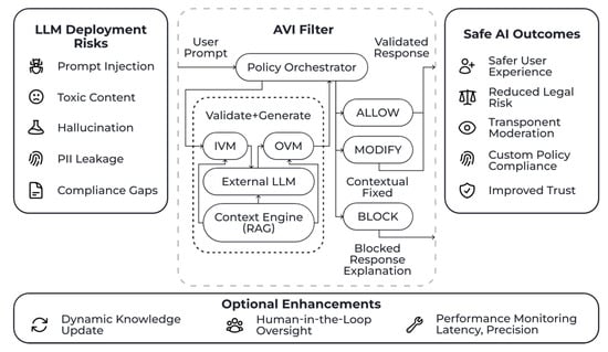 The central hypothesis tested in this work is that the AVI framework can effectively mitigate a broad spectrum of LLM-associated risks (including prompt injection, toxic content, PII leakage, and hallucinations) across diverse LLMs while offering superior flexibility and control compared to relying solely on built-in model safety features and imposing acceptable performance overhead. The main aim of this work is to present the conceptual architecture and methodology of AVI and to evaluate its feasibility and effectiveness through a proof-of-concept (PoC) implementation. We detail the design of the core AVI modules (Input/Output Validation, Response Assessment, and Contextualization Engine) and their orchestration. We introduce a mathematical model and metrics for evaluation. Finally, we present preliminary results from our PoC evaluation, demonstrating AVI’s potential to enhance the safety, reliability, and ethical alignment of LLM interactions. This work contributes a practical and adaptable architectural pattern for governing LLM usage, aiming to make LLMs more trustworthy and applicable in critical domains like finance, healthcare, education, and enterprise applications, thereby fostering responsible AI adoption. The described principles are intended to be comprehensible to a broad audience of scientists and engineers working with applied AI.