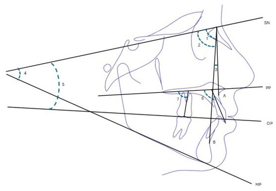 Cephalometric angular measurements: (1) SNA°, sella–nasion–A point; (2) SNB°, sella–nasion–B point; (3) ANB°, A point–nasion–B point; (4) SN-MP°, sella–nasion–mandibular plane; (5) SN-OP°, sella–nasion–occlusal plane; (6) U1-PP°, maxillary central incisor–palatal plane; (7) U6-PP°, maxillary first molar–palatal plane.