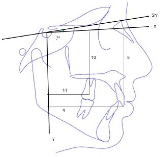 Cephalometric linear measurements: 7°: Angle between SN plane and X plane; (8) U1-X (mm), distance from maxillary central incisor to X plane; (9) U1-Y (mm), distance from maxillary central incisor to Y plane; (10) U6-X (mm), distance from maxillary first molar to X plane; (11) U6-Y (mm), distance from maxillary first molar to Y plane.