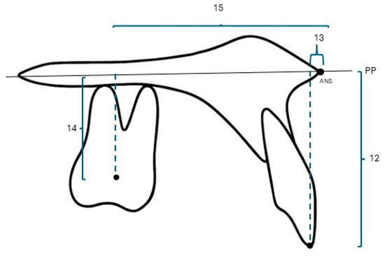 Measurements in superimposition of the maxilla. (12) U1-PP (mm), distance from maxillary incisor tip to palatal plane; (13) U1-ANS (mm), distance from maxillary incisor to anterior nasal spina; (14) U6-PP (mm), distance from maxillary first molar to palatal plane; (15) U6-ANS (mm), distance from maxillary first molar to anterior nasal spina.
