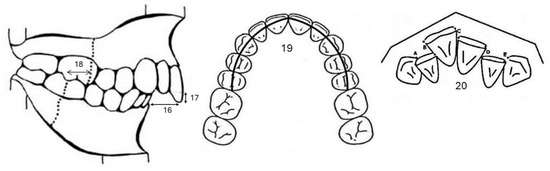 Measurements on the orthodontic model: (16) overjet (mm); (17) overbite (mm); (18) molar relationship (mm); (19) maxillary arc length (mm); (20) maxillary irregularity index (mm).