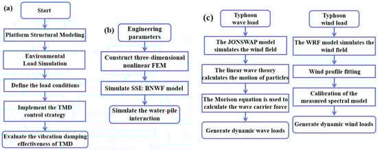 Overall research flow. (a) Main process; (b) Platform structure modeling process; (c) Environmental load simulation process.