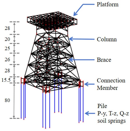 This study employs the OpenSees software Version 3.7.1 to develop a high-fidelity finite element (FE) model of the offshore platform for dynamic analysis. As illustrated in Figure 4, the FE model comprises 456 nodes and 956 elements, strategically discretized to balance computational efficiency and resolution. Structural components are modeled using beam-column elements, and the nonlinear pile-soil interaction is simulated using the PySimple1, TzSimple1, and QzSimple1 material models within the OpenSees framework to capture axial, lateral, and tip resistance mechanisms. In this paper, the mesh size adopted in Ref. [25] is that the element length of the Tubular Joints is 1.5 D (D represents the outer diameter of the tubular component). Ref. [26] sets the time step as , where denotes the fundamental period.