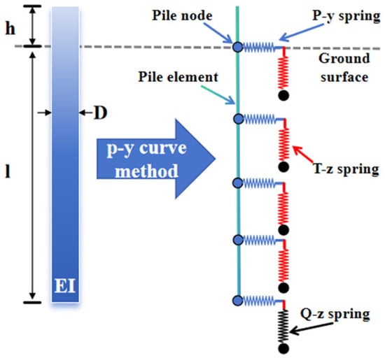 Existing simulation techniques for pile-soil interaction forces primarily include direct consolidation modeling, equivalent fixed-base modeling, m-method simulation, and P-y curve analysis. Among these, the direct consolidation approach overlooks pile-soil interaction, while the equivalent fixed-base method ignores soil effects [27]. Considering the soil properties in the East China Sea, this study employs P-y, T-z, and Q-z curve methodologies for simulation. The P-y curve method is rooted in elastic subgrade reaction theory: as depicted in Figure 5, it substitutes soil with nonlinear soil springs, overcoming the limitations of earlier linear elastic spring models. This approach accurately captures the nonlinear response of soil surrounding piles under loading conditions.