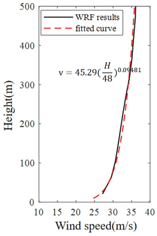 Figure 6 illustrates the wind profile at the most critical moment. A customized wind profile, derived by fitting an exponential function to WRF simulation results, is input into the typhoon module to generate turbulent wind speeds. Importantly, the application of WRF in this study was validated against available field measurements. Specifically, the exponential wind profile fit applied to the WRF output (as shown in Figure 6) was calibrated using measured wind data from the target site in Taizhou. Furthermore, the key spectral model (Equation (12)) used within the Zwind typhoon module to characterize turbulence was itself derived from and fitted to field-measured data at the site. Additionally, the turbulence intensity values utilized in the analysis (0.1023, 0.0665, and 0.0665) were directly obtained from these field measurements. This multi-faceted approach—calibrating the mean wind profile shape, employing a site-fitted turbulence spectrum, and incorporating measured turbulence intensities—provides a robust validation foundation for the WRF-simulated wind conditions used in this specific engineering scenario. When a structure obstructs the airflow path, it induces stagnation or deflection of the airflow, converting the wind’s kinetic energy into static pressure either partially or entirely.