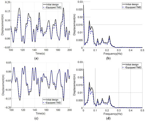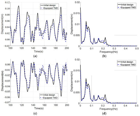 Figure 14, Figure 15 and Figure 16 systematically illustrate the time-domain and frequency-domain responses of acceleration, velocity, and displacement in the X- and Y-axis directions for the DTMD and Initial Design (ID) under misaligned typhoon and wave load conditions. In the X-axis direction, the peak values of displacement, velocity, and acceleration in the time domain are 0.17 m, 0.58 m/s, and 0.75 m/s2, respectively. For the DTMD, the corresponding values are 0.14 m, 0.49 m/s, and 0.54 m/s2, representing reductions of 17.65%, 15.52%, and 28.00%, respectively. In the Y-axis direction, the peak values of displacement, velocity, and acceleration in the time domain are 0.30 m, 0.84 m/s, and 0.85 m/s2, respectively. For the DTMD, the corresponding values are 0.24 m, 0.68 m/s, and 0.70 m/s2, representing reductions of 20.00%, 19.05%, and 17.65%, respectively. In both the X-axis and Y-axis directions, the displacement and velocity responses exhibit multiple distinct peaks within the low-frequency range, while the acceleration response demonstrates predominant spectral energy concentration within the same frequency band. The implemented TMD significantly mitigates the low-frequency peaks in acceleration and achieves additional reduction in the peaks of displacement and velocity responses. The energy dissipation efficiency for this condition is 59.8% in the X-direction and 68.2% in the Y-direction.