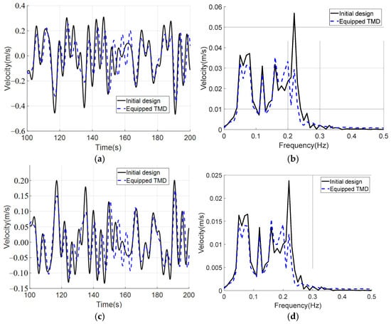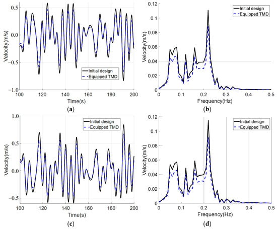 Deck velocity under a misaligned typhoon and typhoon-wave. (a) Time-domain simulation results in the X-axis direction; (b) Frequency-domain simulation results in the X-axis direction; (c) Time-domain simulation results in the Y-axis direction; (d) Frequency-domain simulation results in the Y-axis direction.