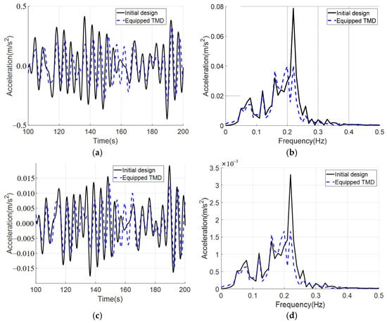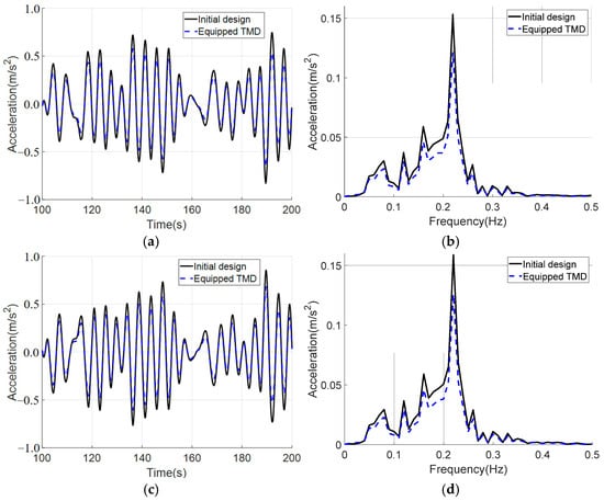 Deck acceleration under a misaligned typhoon and typhoon-wave. (a) Time-domain simulation results in the X-axis direction; (b) Frequency-domain simulation results in the X-axis direction; (c) Time-domain simulation results in the Y-axis direction; (d) Frequency-domain simulation results in the Y-axis direction.