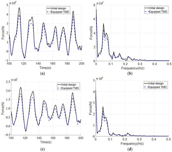 Figure 13 illustrates the influence of the TMD on the base shear at the leg bottom under aligned typhoon-wave load conditions. In the X-axis direction, the maximum and minimum base shear values for the IDD are 4715.8 kN and −743.8 kN, respectively, while the corresponding values for the DTMD are 3880.8 kN and −667.0 kN, representing reductions of 17.71% and increases of 10.33%, respectively. In the Y-axis direction, the absolute maximum and minimum base shear values for the IDD are 219.0 kN and −27.8 kN, respectively, whereas the DTMD values are 181.1 kN and −24.2 kN, showing reductions of 17.31% and increases of 12.95%, respectively. Spectral analysis of the shear force reveals that energy in both X- and Y-axis directions is predominantly concentrated within the low-frequency range of 0~0.7 Hz, with the TMD achieving significant peak attenuation.