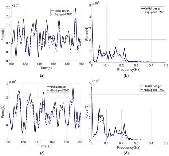Figure 17 illustrates the influence of the TMD on the base shear at the leg bottom under misaligned typhoon-wave load conditions. In the X-axis direction, the maximum and minimum base shear values for the IDD are 2431.9 kN and −279.6 kN, respectively, while the corresponding values for the DTMD are 1865.5 kN and −142.1 kN, representing reductions of 23.29% and increases of 49.17%, respectively. In the Y-axis direction, the absolute maximum and minimum base shear values for the IDD are 269.2 kN and −59.0 kN, respectively, whereas the DTMD values are 205.0 kN and −46.3 kN, showing reductions of 23.85% and increases of 21.53%, respectively. Spectral analysis of the shear force reveals that energy in both X- and Y-axis directions is predominantly concentrated within the low-frequency range of 0~0.2 Hz, where the TMD achieves significant peak attenuation.