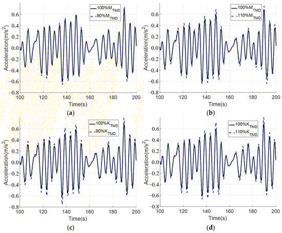 The time-domain simulation results of deck acceleration in the Y-axis direction under misaligned typhoon and typhoon-wave loads. (a) The comparison between 90% MTMD and 100% MTMD; (b) The comparison between 110% MTMD and 100% MTMD; (c) The comparison between 90% KTMD and 100% KTMD; (d) The comparison between 110% KTMD and 100% KTMD.
