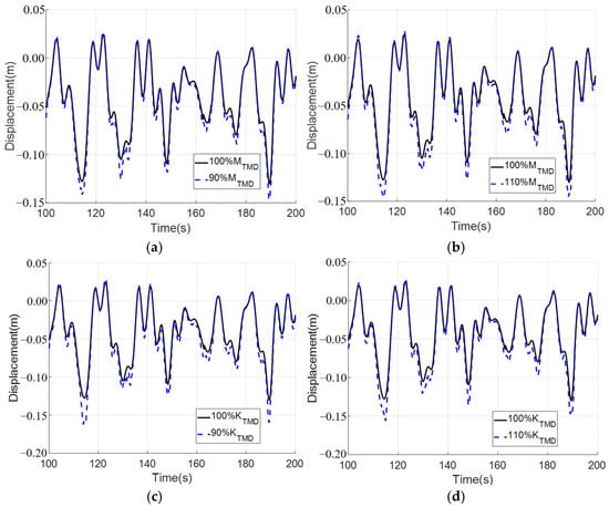 The time-domain simulation results of deck displacement in the Y-axis direction under misaligned typhoon and typhoon-wave loads. (a) The comparison between 90% MTMD and 100% MTMD; (b) The comparison between 110% MTMD and 100% MTMD; (c) The comparison between 90% KTMD and 100% KTMD; (d) The comparison between 110% KTMD and 100% KTMD.