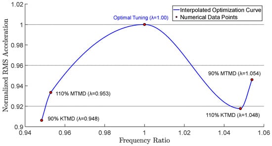 Based on the data in Table 3, we plotted a curve of the frequency ratio () versus the normalized root-mean-square (RMS) acceleration. As shown in Figure 20, the frequency without disturbance achieves an almost minimum structural response. Figure 20 also intuitively demonstrates that the overall performance decreases asymmetrically.