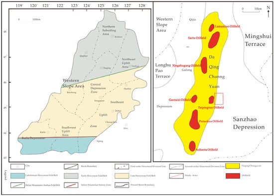 The Weixing oilfield under study is located in Anda City, Heilongjiang Province, within the northern Songliao Basin, adjacent to Changde Town. Its tectonic setting lies in the northwestern part of the Sanzhao Depression, characterized as an uplifted structural slope belt sloping toward the Daqing Placanticline. The target reservoir, the Putaohua oil layer, belongs to the First Member of the Yaojia Formation (Cretaceous System). It was deposited during the retrogradational and fill stages of the Songliao Basin’s overall subsidence, spanning the late regressive cycle of the Qingshankou Formation to the early transgressive cycle of the Yaojia Formation. The formation is dominated by interbedded purplish-red, brownish-red, and grayish-green mudstones with grayish-white sandstones, serving as one of the major hydrocarbon-bearing formations in northern Songliao Basin [16,17]. The location of the Weixing oilfield field is shown in Figure 1.