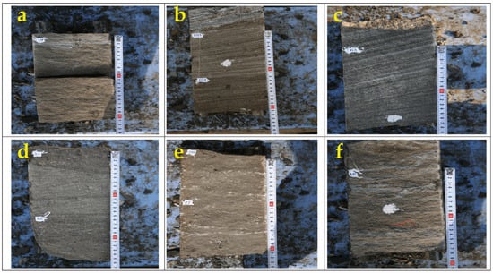 Diagram of typical bedding types: (a) horizontal bedding; (b) parallel bedding; (c) inclined bedding; (d) cross-bedding; (e) massive bedding; (f) flaser bedding.