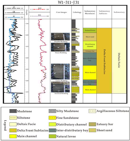 Based on the determination of sedimentary facies types, core–log calibration of key cored wells (e.g., Well W1-1-J31) must be conducted to establish a log-derived microfacies model for the entire study area, thereby providing the foundation for sedimentary microfacies mapping and subsequent analyses (Figure 3).