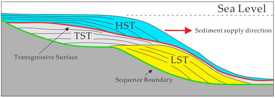 The classical sequence stratigraphy theory typically defines initial transgressive surfaces (ITSs) and maximum flooding surfaces (MFSs) as sequence boundaries, allowing for the identification of three major system tracts, the lowstand system tract (LST), transgressive system tract (TST), and highstand system tract (HST), as shown in Figure 4, a schematic diagram of the three major units of sequence stratigraphic domains. These tracts comprehensively document sea-level fluctuation cycles. The lowstand system tract develops at the basement of stratigraphic sequences, characterized by slow vertical aggradation and normal regression deposits [22,23]. The transgressive system tract, situated between the ITS and MFS, exhibits regressive stacking patterns due to backstepping depositional processes. In contrast, the highstand system tract overlies the TST and is dominated by progradational stratal architectures [24].
