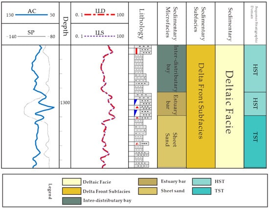 This study employs well logging curve image datasets combined with sequence system tract classifications to identify morphological characteristics of well logging facies, thereby providing critical diagnostic criteria for sedimentary microfacies recognition. For example, Figure 5 illustrates a sedimentary microfacies pattern derived from well logging facies analysis. The diagram utilizes natural gamma ray (GR), spontaneous potential (SP), acoustic (AC), laterolog deep resistivity (LLD), and laterolog shallow resistivity (LLS) curves. By integrating their morphological features with lithological data obtained from stratigraphic exploration at relative depths, a comprehensive dataset for sedimentary microfacies identification is constructed.